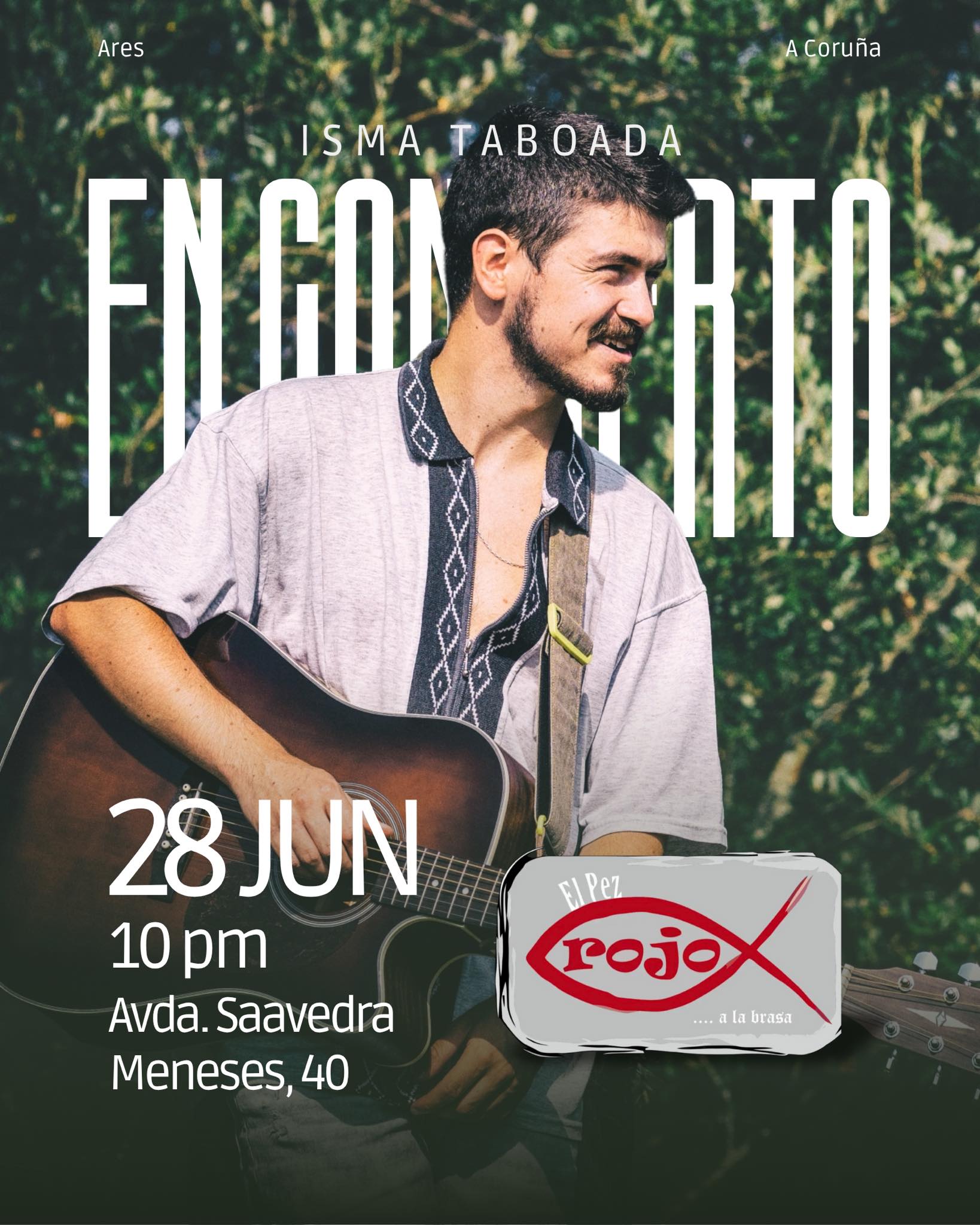 El próximo sábado 28 de junio, el cantautor ferrolano Isma Taboada vuelve a subirse a los escenarios con un concierto íntimo en el restaurante El Pez Rojo a la brasa, en Ares. A partir de las 22:00 h, la música en formato acústico tomará el relevo al calor del verano, en una velada pensada para escuchar de cerca y sin prisas.
