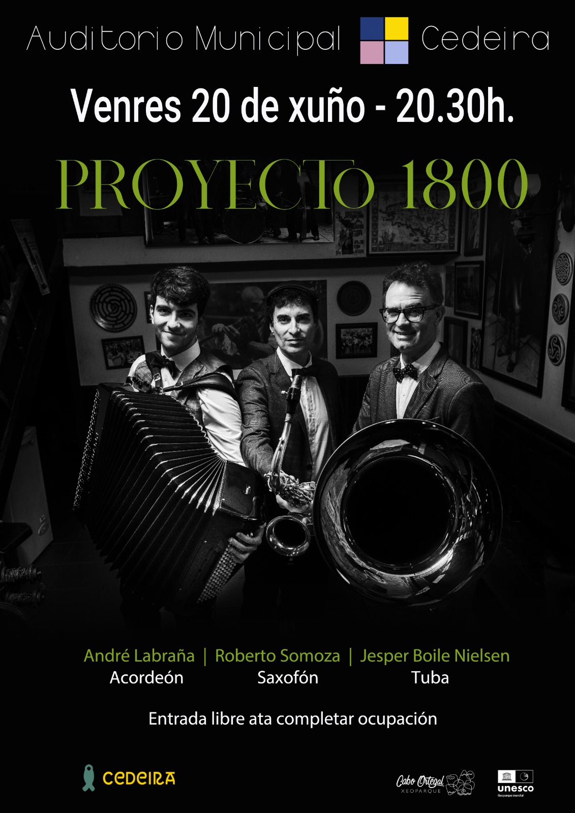 Este viernes 20 de junio, a las 20.30 h, el Auditorio Municipal de Cedeira acoge el concierto de Proyecto 1800, un trío formado por André Labraña (acordeón), Roberto Somoza (saxofón) y Jesper Boile Nielsen (tuba) que rinde homenaje a la música compuesta entre 1800 y 1900.