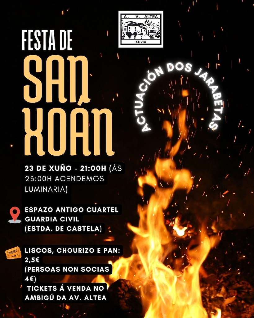 El barrio de Xuvia, en Narón, se suma este año a las celebraciones de San Xoán con una fiesta organizada por la Asociación Veciñal Altea que promete mantener vivo el espíritu tradicional de esta noche tan especial. Será el lunes 23 de junio a partir de las 21:00 horas en el espacio del antiguo cuartel de la Guardia Civil, en plena Carretera de Castilla.